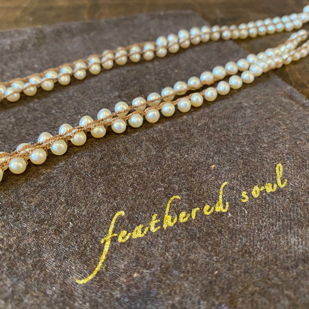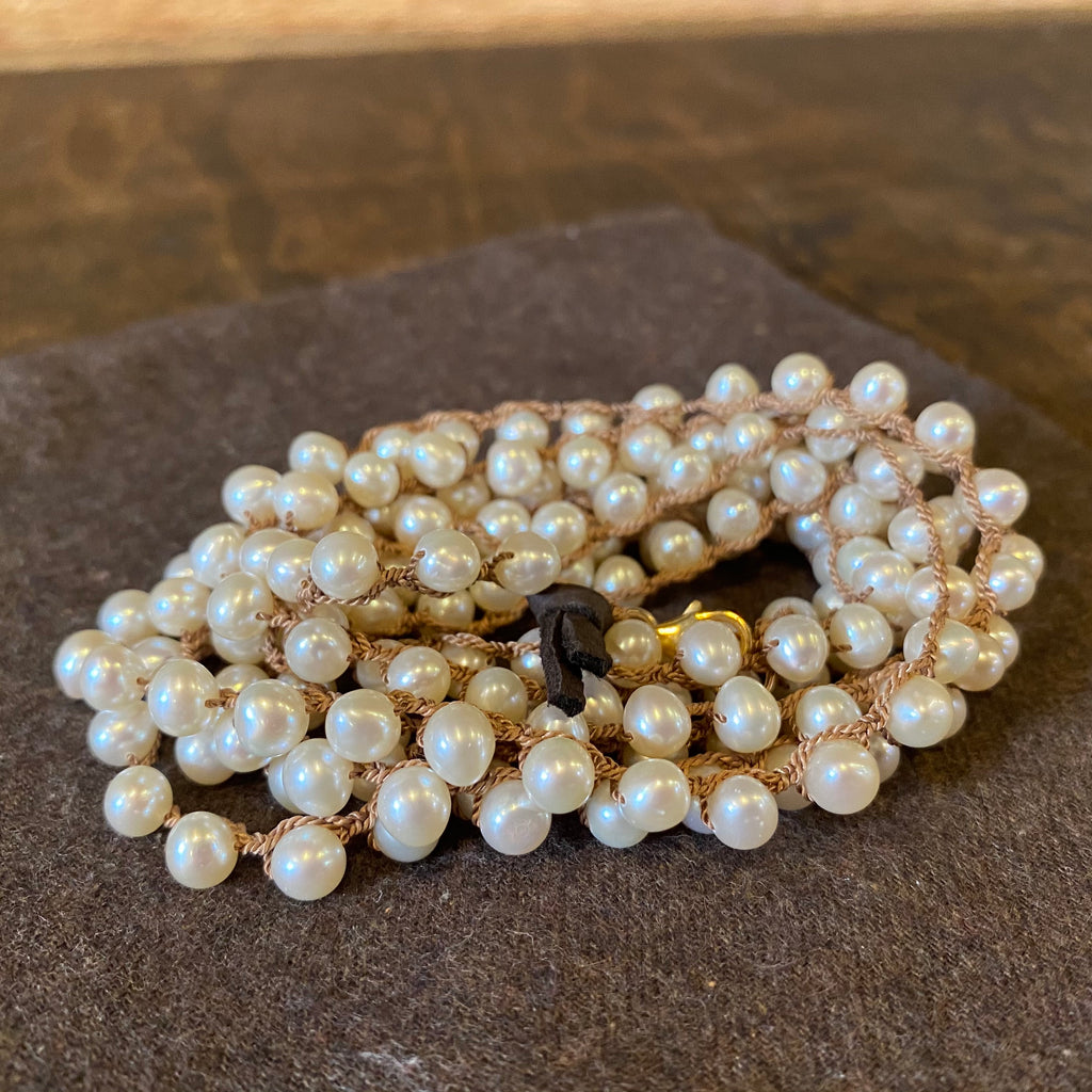 Stunning 6mm White Pearls on hand-woven beige silk.  Add a stylist twist to this classic stone.  Can be worn as a necklace or bracelet.