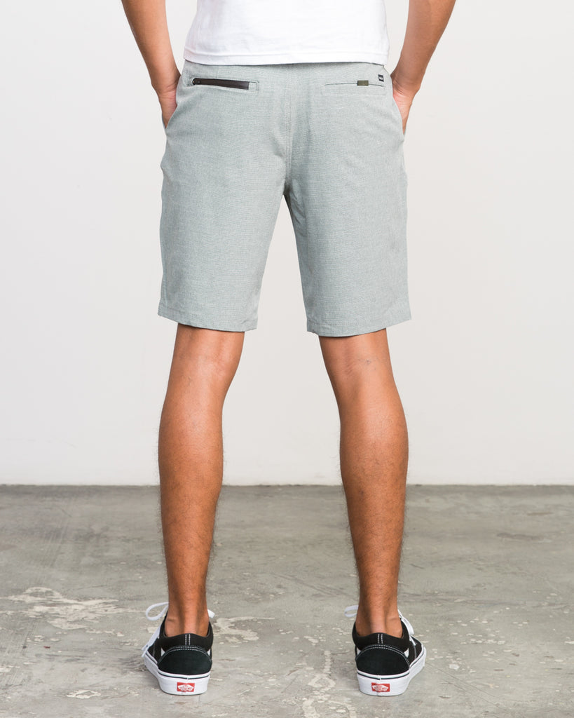 The RVCA Balance Hybrid Short is a 4-way performance stretch short with DWR coating and a silicone hybrid button at the center front. It has a back left pocket with a reverse coil zipper and a back right welt pocket with nylon pull tabs.