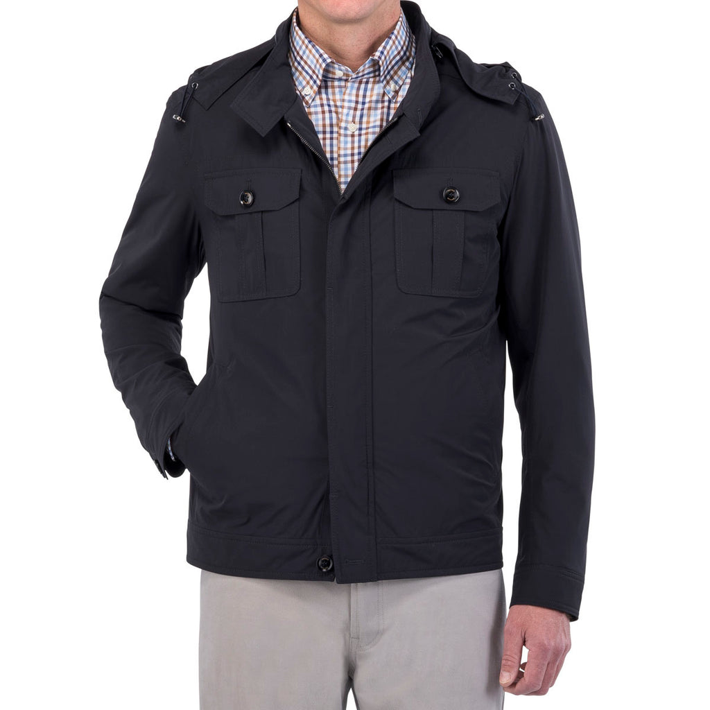 A clean and modern style for fall and winter wearing, the Voyager Stretch Blouson is constructed from water and wind-resistant, high-stretch microfiber. Interior features luxurious glen plaid lining. Styled with rollup, removable hood, besom leather buttonhole, genuine horn buttons and Italian hardware.