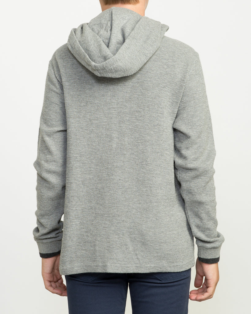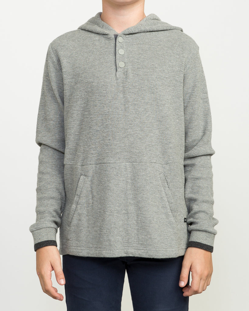 The RVCA Boy's Copa Hoodie is a pullover hoodie with a 3-button henley placket and a RVCA solo label at the hem. It has long sleeves with contrast ribbing at the hems and internal welt pockets at the side seam.