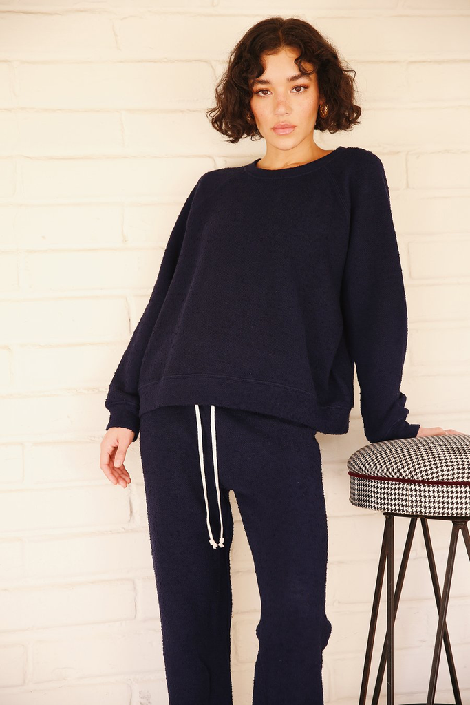 The Brentwood Sweatshirt features a perfectly relaxed, oversized fit and a raglan sleeve. Our Cotton Boucle has become an instant best seller, with it's incredibly soft feel and pretty texture. A fresh take on a vintage inspired sweatshirt. This sweatshirt does it all. Pair it with our Sweatpants, a printed skirt and of course, always vintage denim. We've worn this sweatshirt Cityside to Seaside.