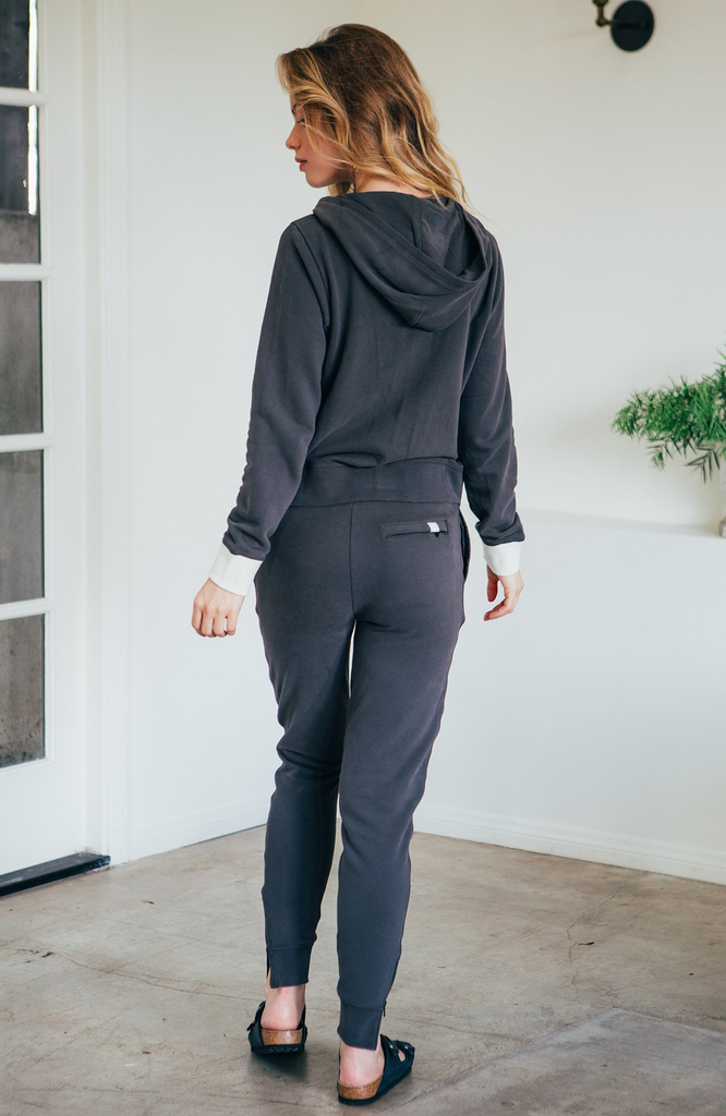 Our softest French Terry gets a lift with a duel Riri zipper and colorblock side panel details.