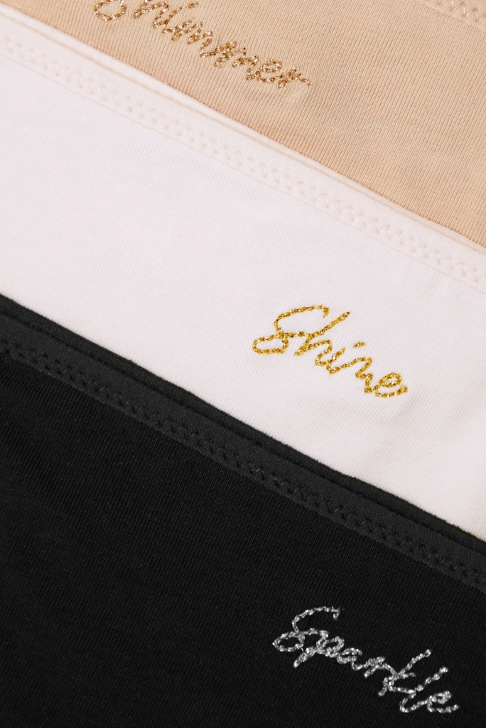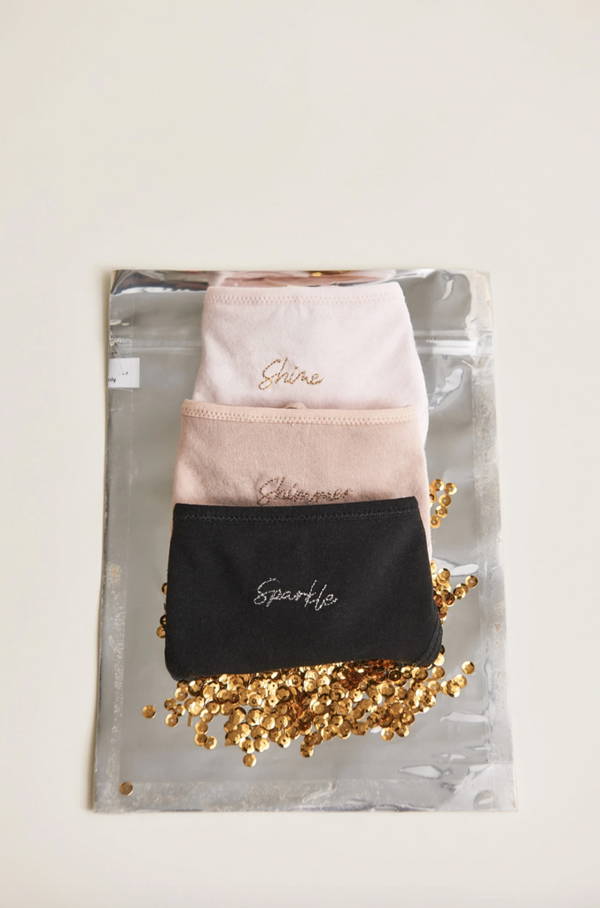 The Holiday G-String 3 Pack includes three G-strings embroidered with 'Sparkle', 'Shine' and 'Shimmer' in silver and gold threads. Made from stretchy organic Pima cotton-jersey, they have a mid-rise waist with slim straps that remain virtually undetectable beneath fitted pants and skirts. They come in a compostable pouch, too.