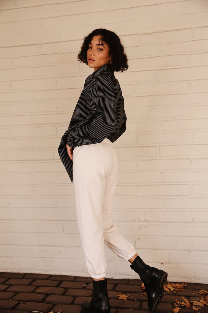 We designed our perfect sweatpant. The Vintage Sweatpant features a cropped, relaxed fit with an elastic waistband and drawcord. The Cotton Boucle fabric is incredibly soft and adds a new twist to this classic style. Chic comfort at it's finest.